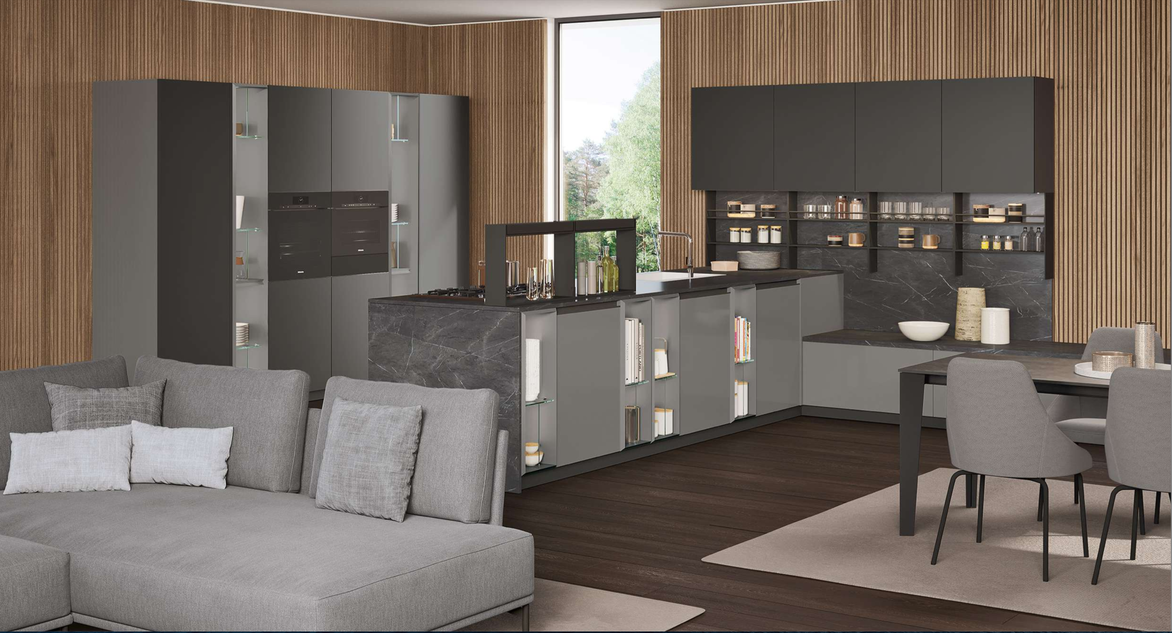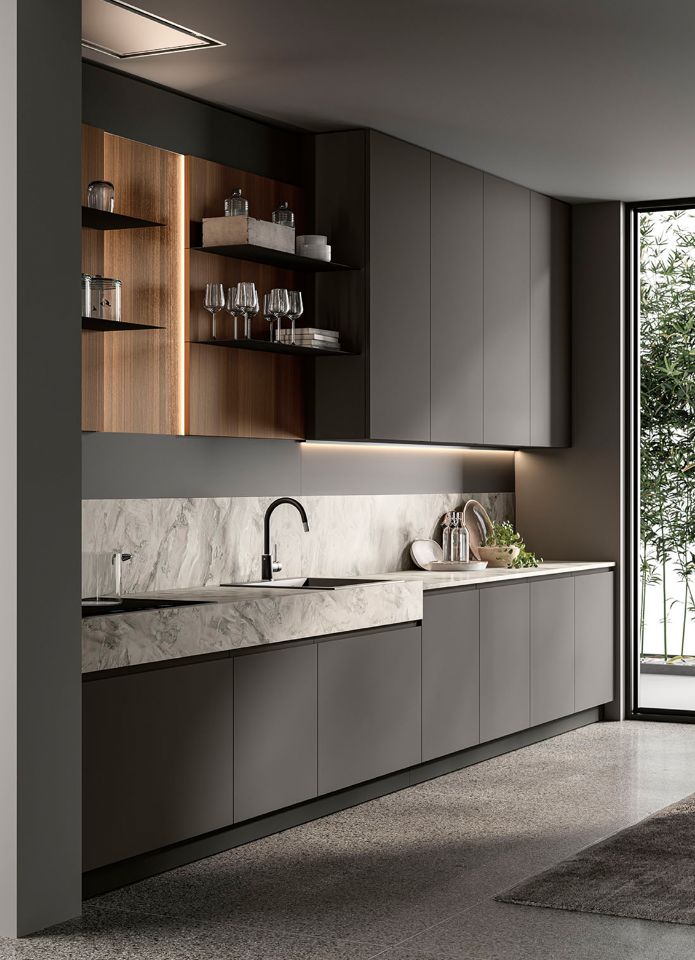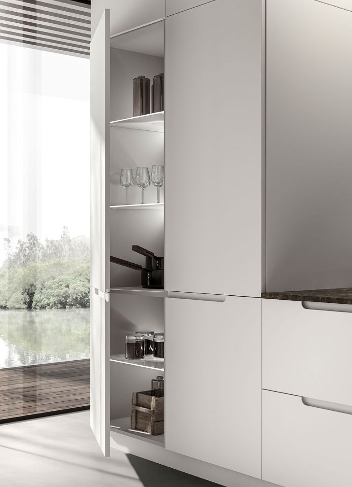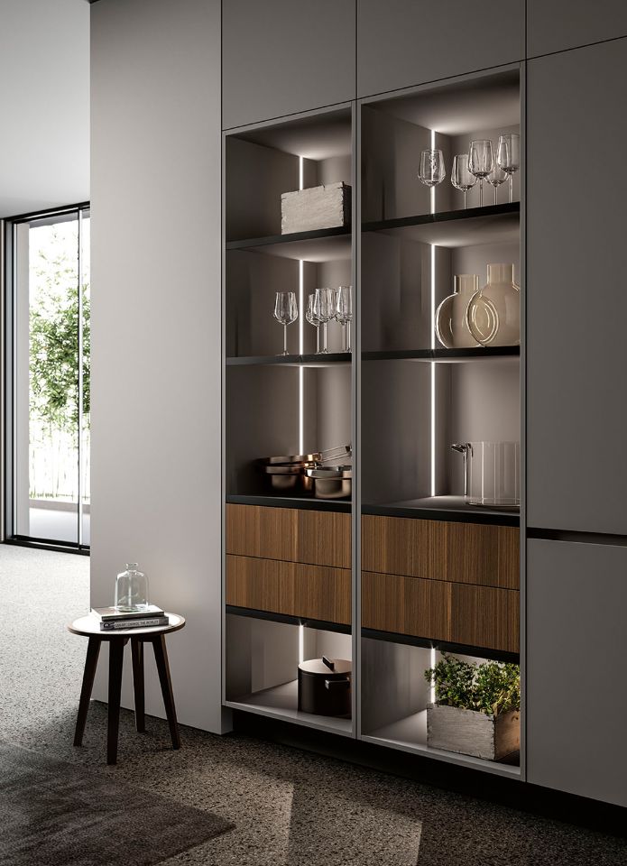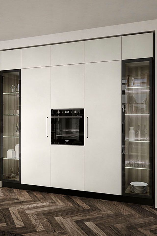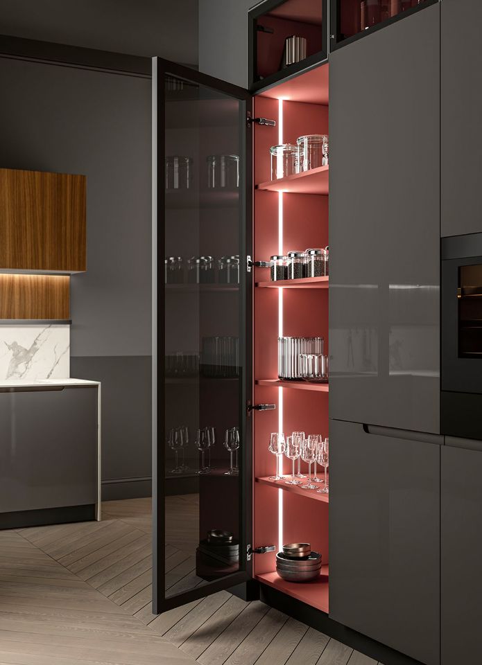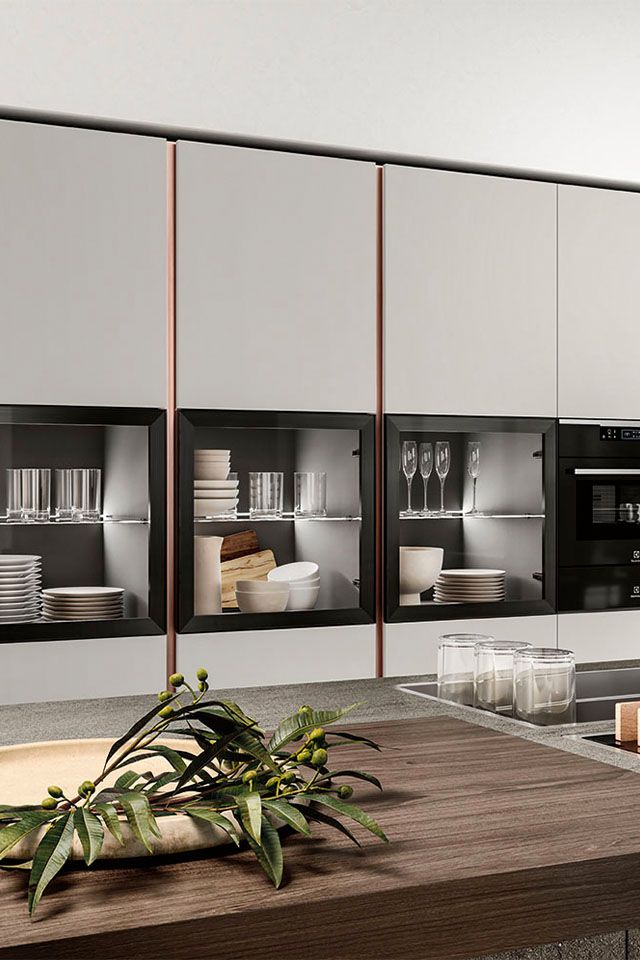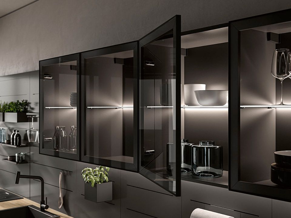 Elegance detaļās un materiālos, piemēram, vertikāls iekšējais apgaismojums un Tecno vitrīnu fasāžu durtiņas. Līnijas un dizains kalpo racionālai darba telpas organizēšanai virtuvē.