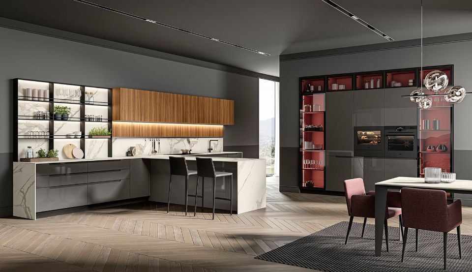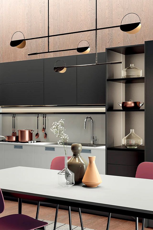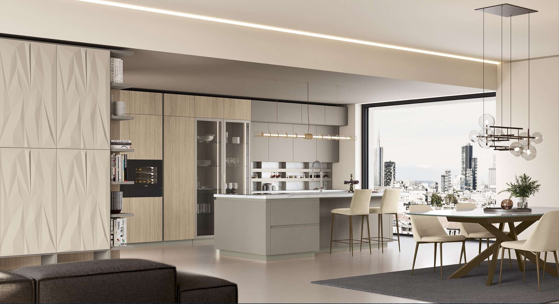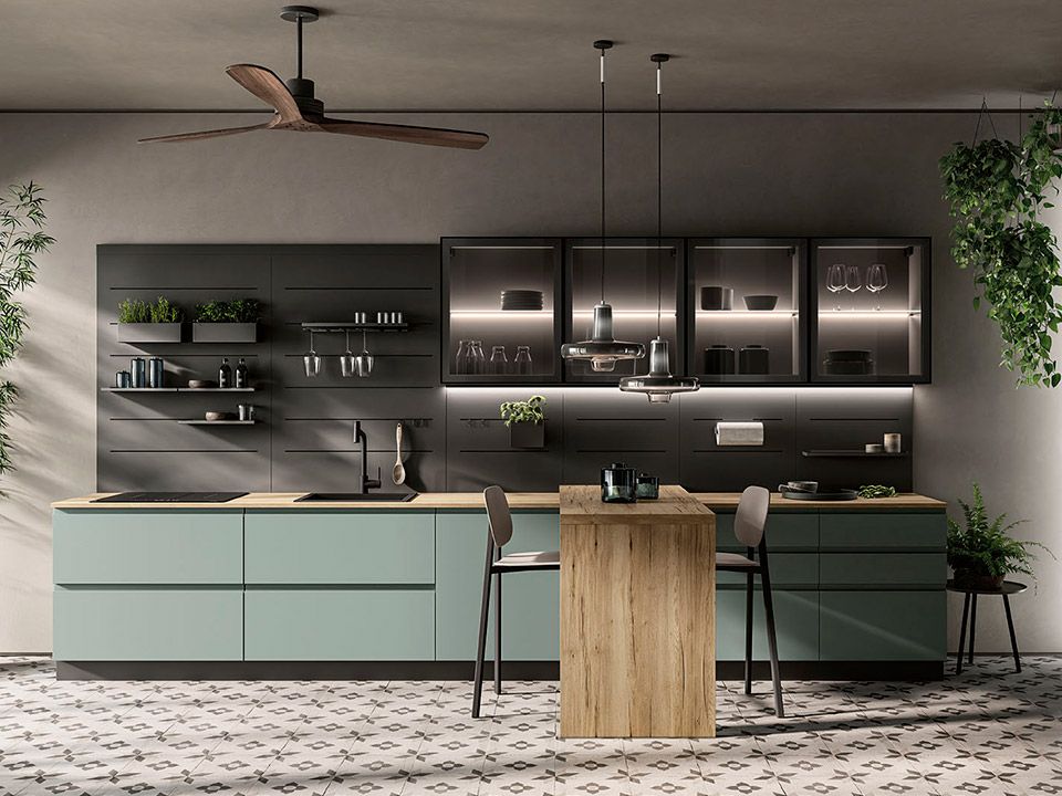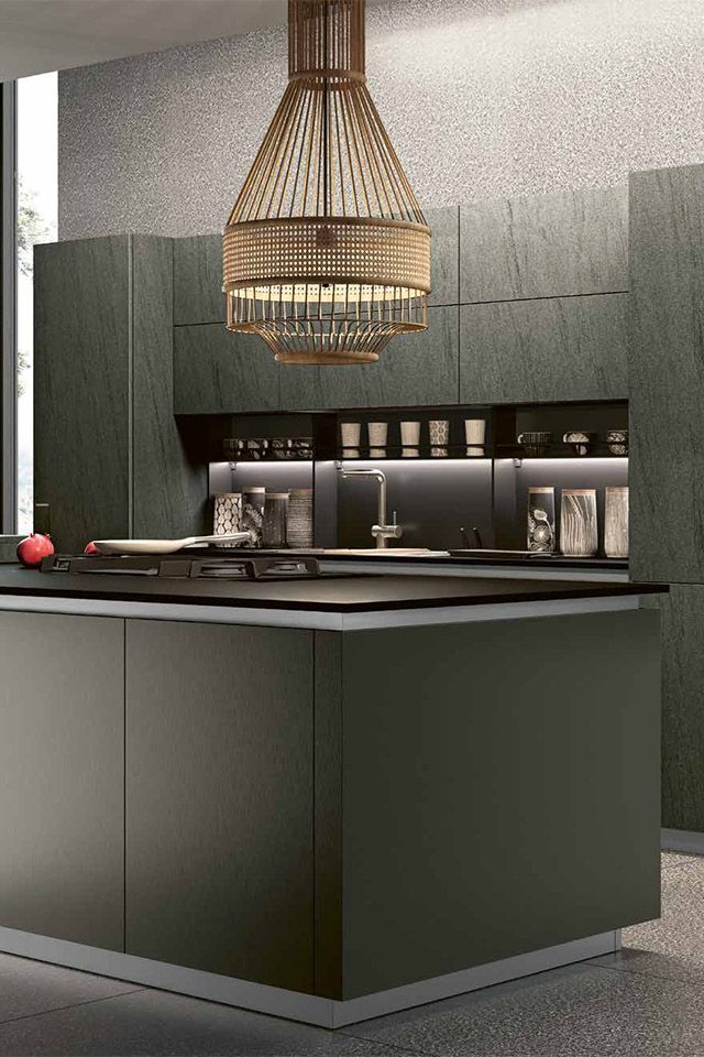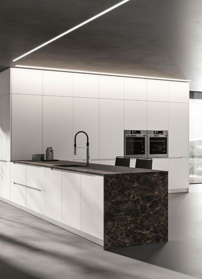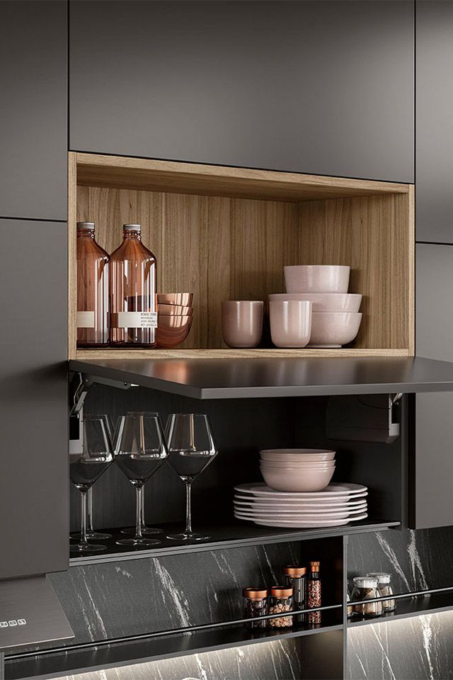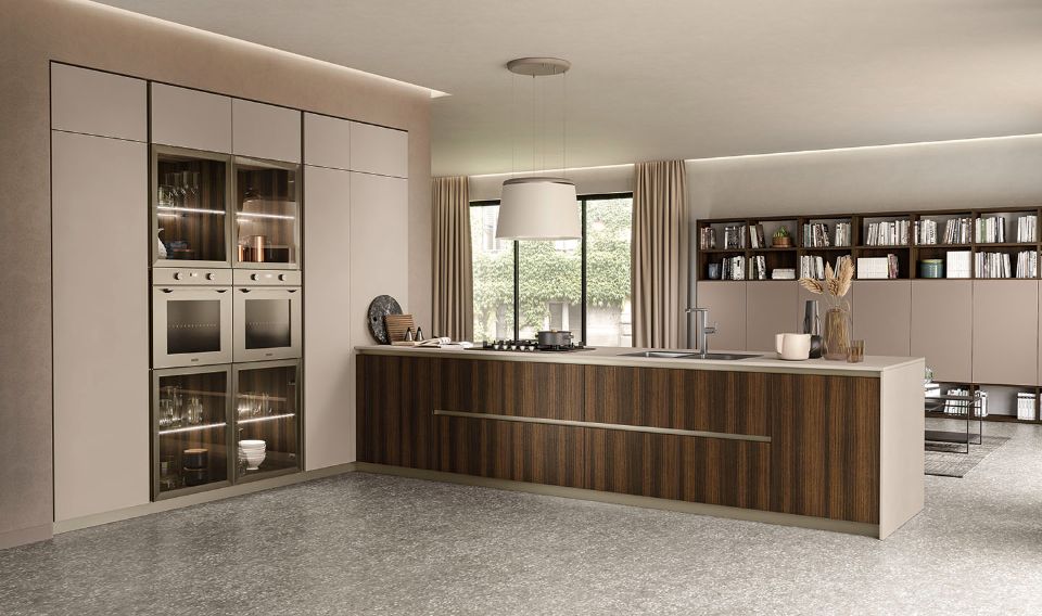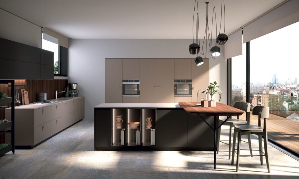 Elegance detaļās un materiālos, piemēram, vertikāls iekšējais apgaismojums un Tecno vitrīnu fasāžu durtiņas. Līnijas un dizains kalpo racionālai darba telpas organizēšanai virtuvē.