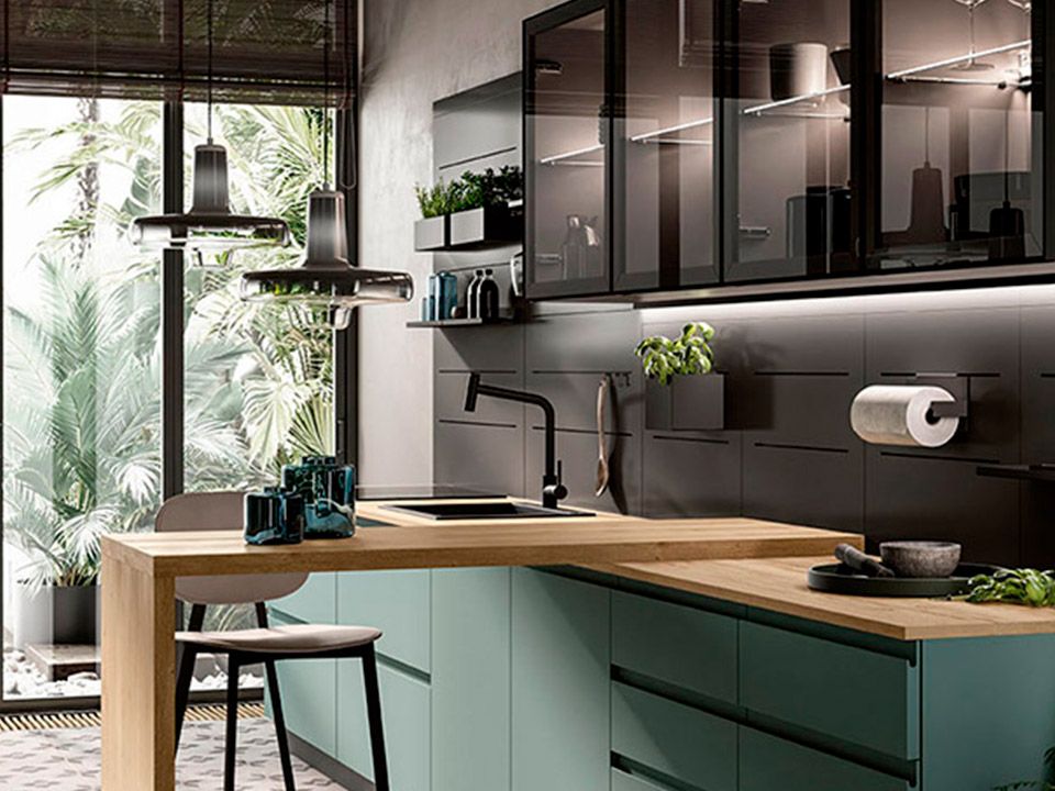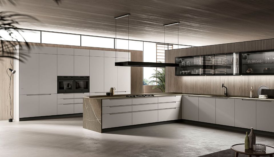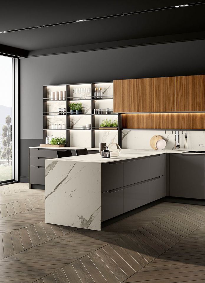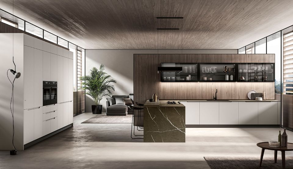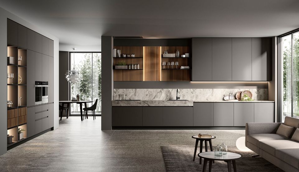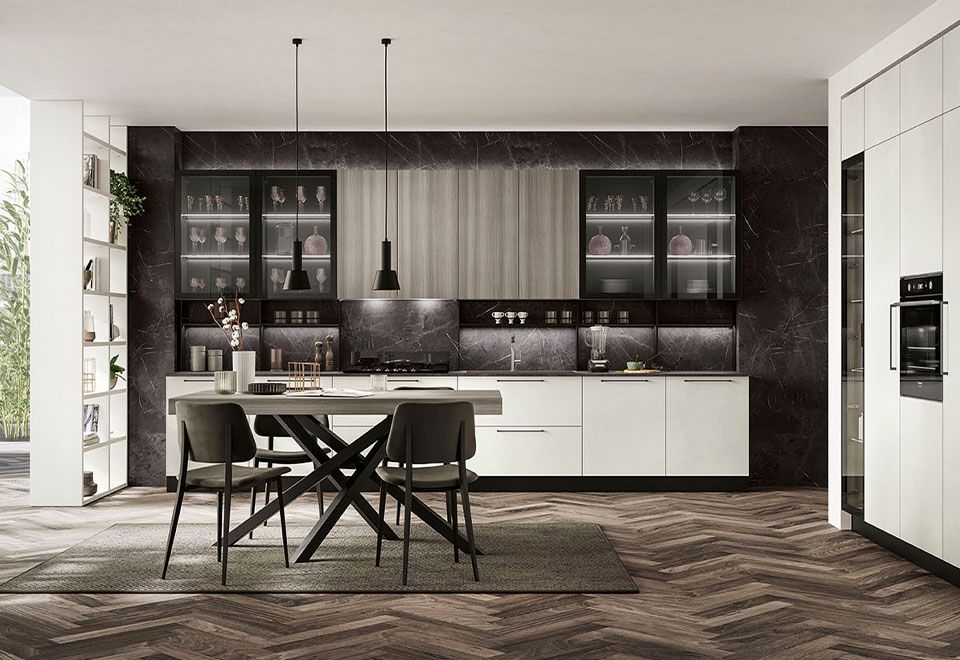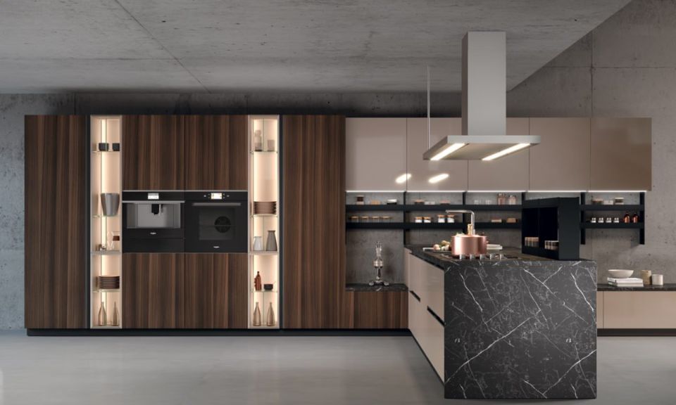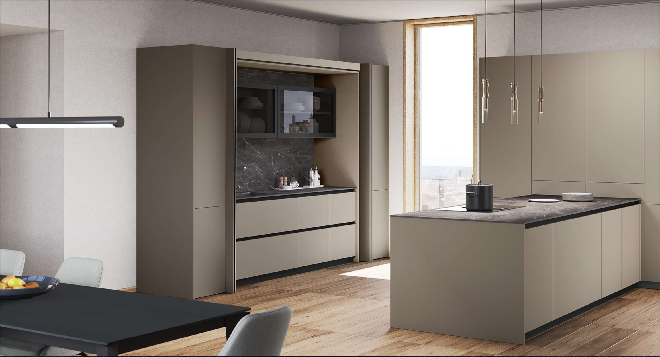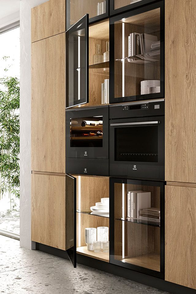 Elegance detaļās un materiālos, piemēram, vertikāls iekšējais apgaismojums un Tecno vitrīnu fasāžu durtiņas. Līnijas un dizains kalpo racionālai darba telpas organizēšanai virtuvē.