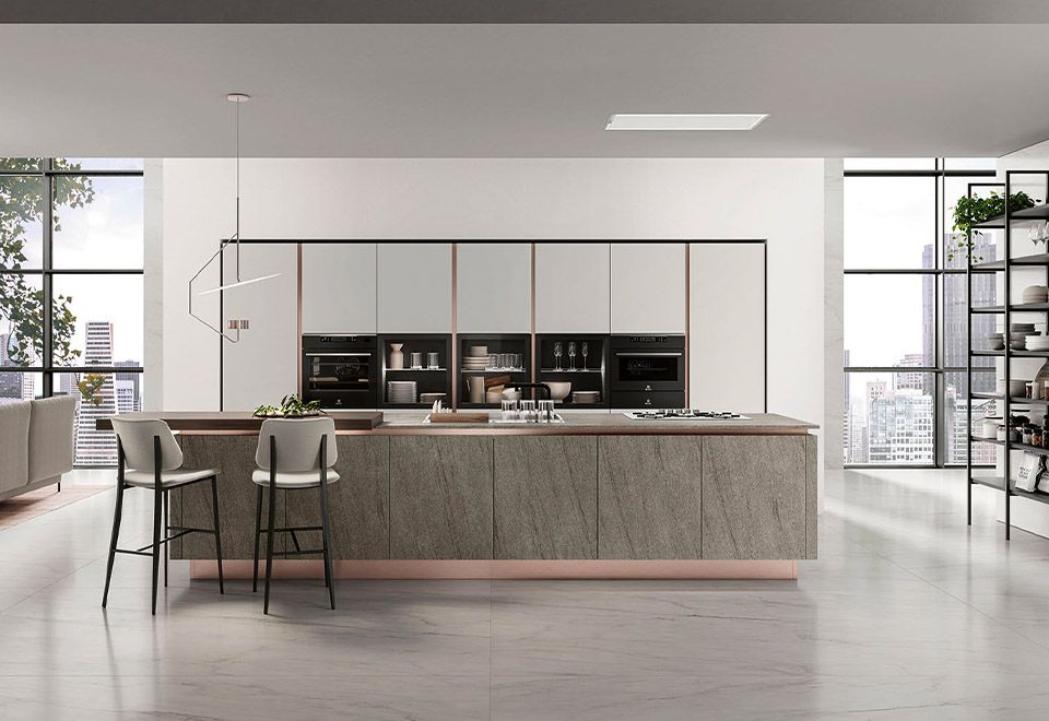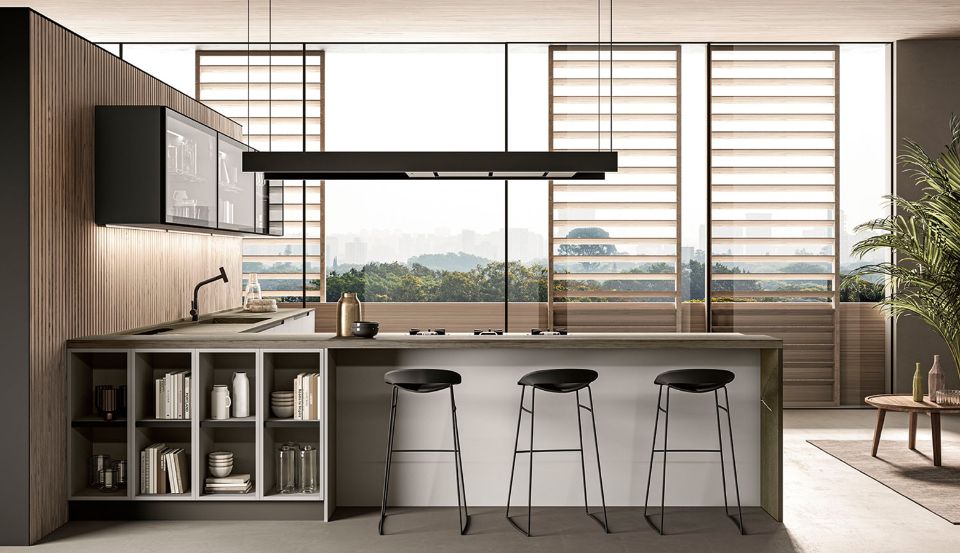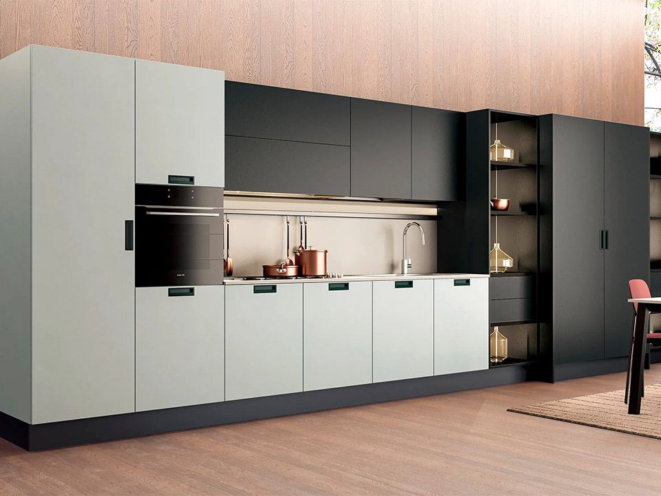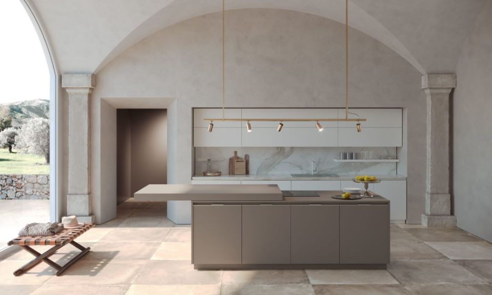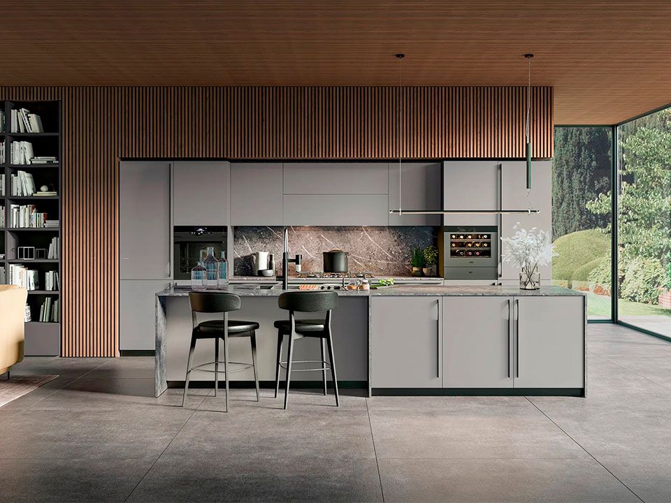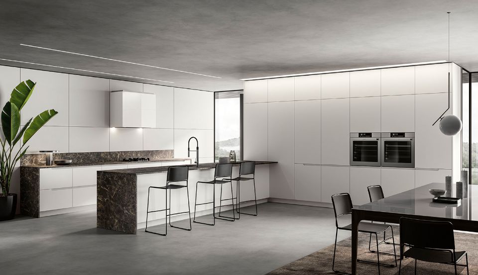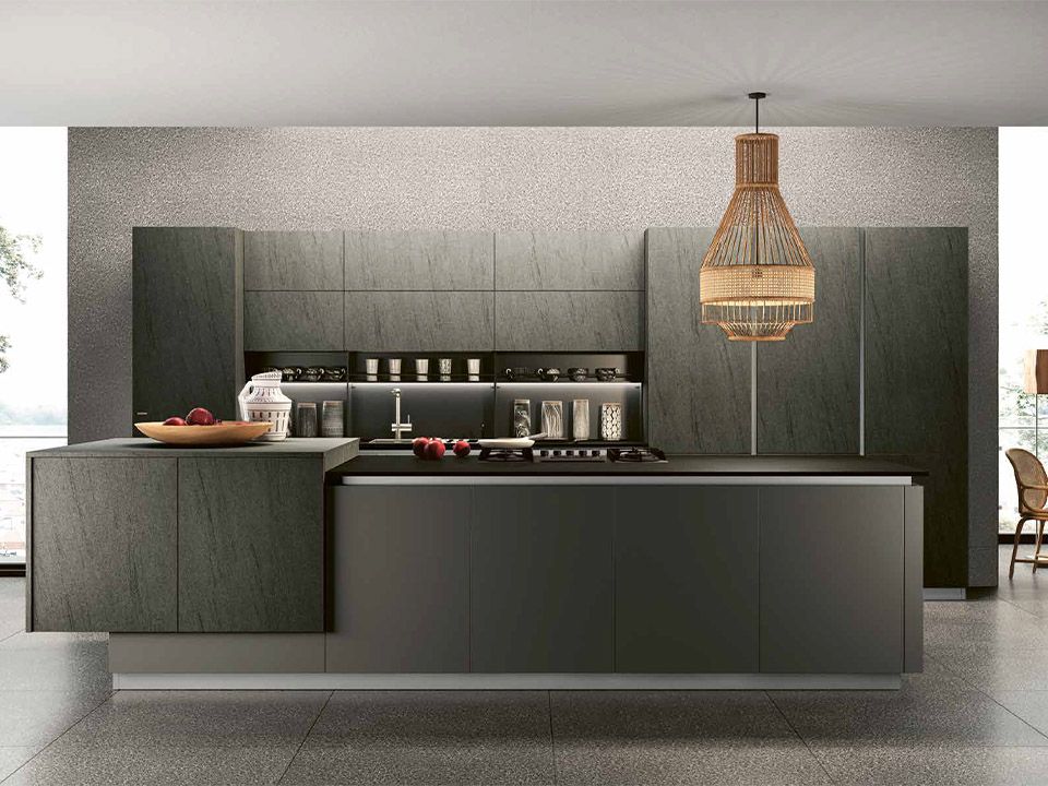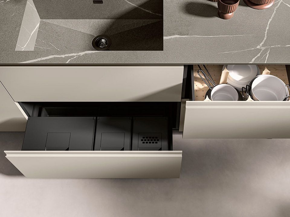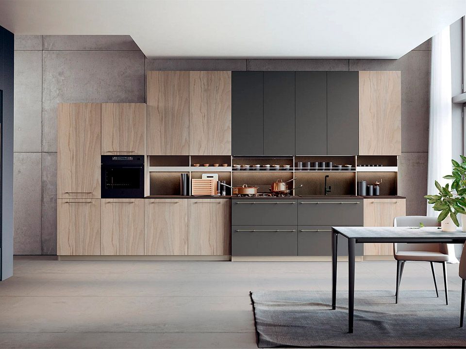 Elegance detaļās un materiālos, piemēram, vertikāls iekšējais apgaismojums un Tecno vitrīnu fasāžu durtiņas. Līnijas un dizains kalpo racionālai darba telpas organizēšanai virtuvē.