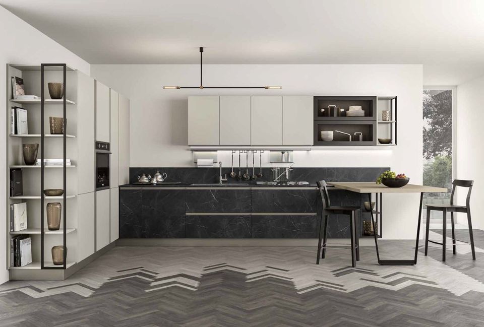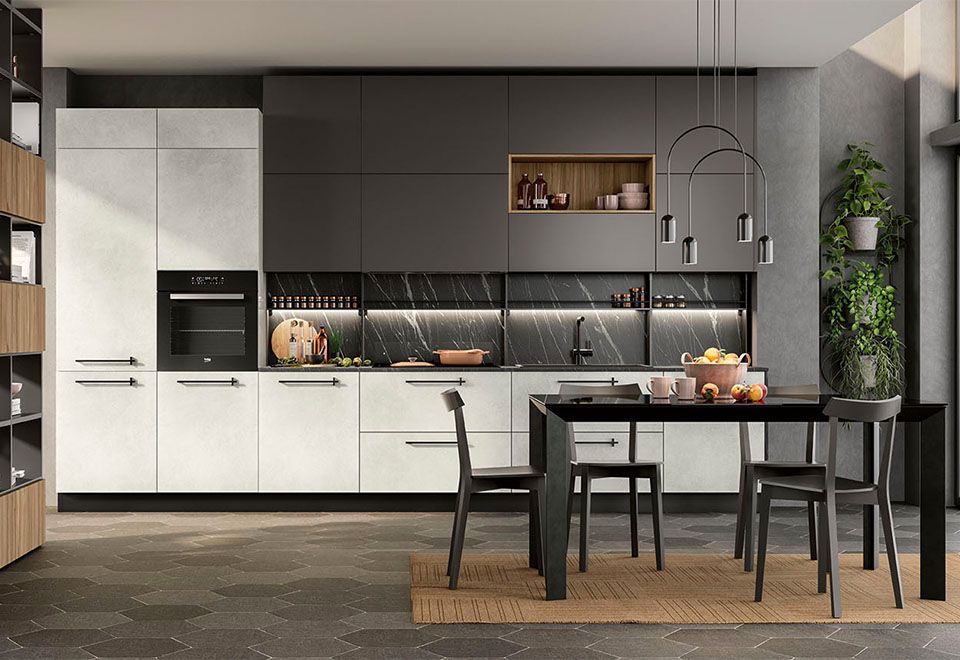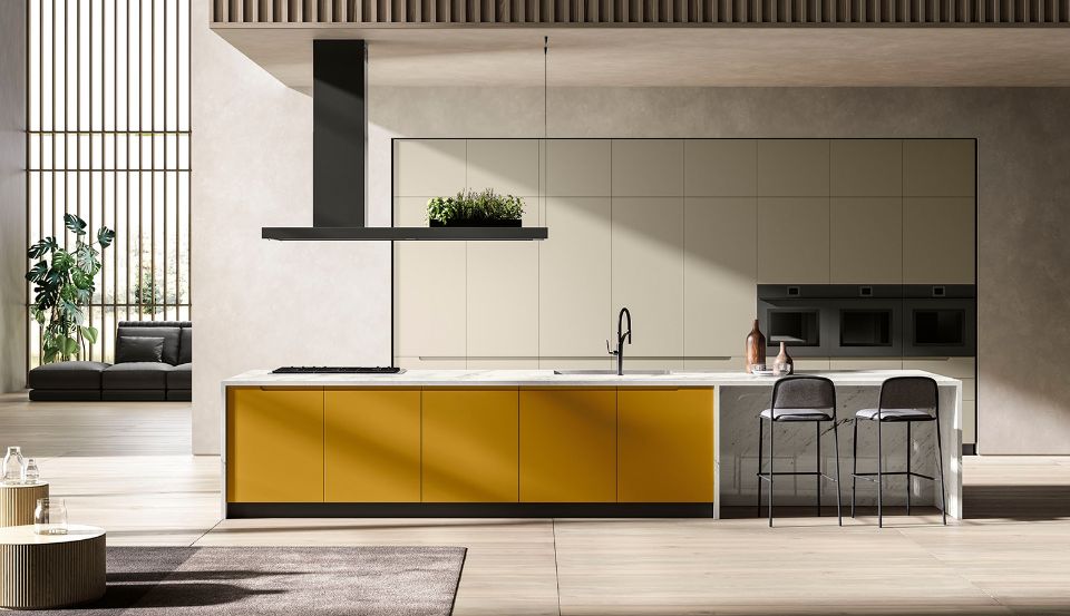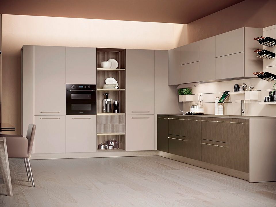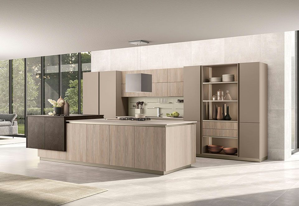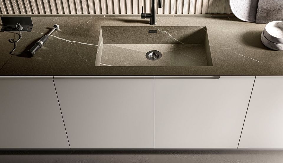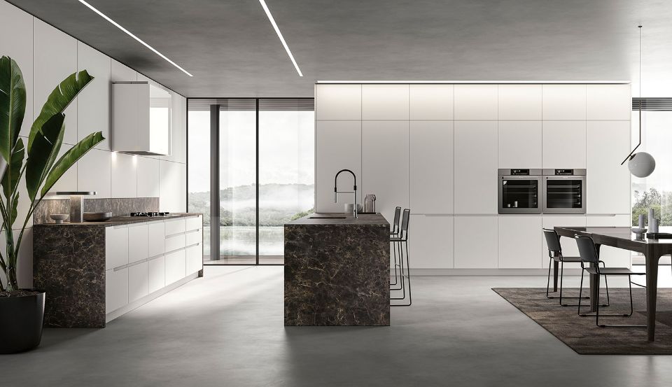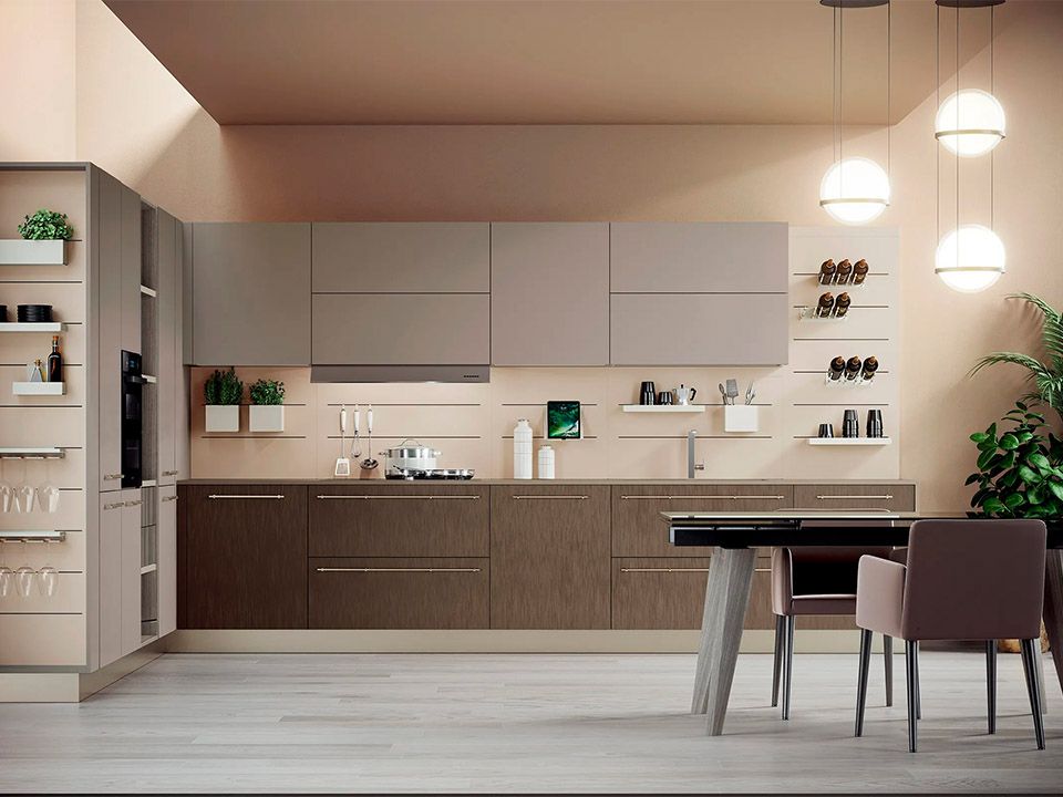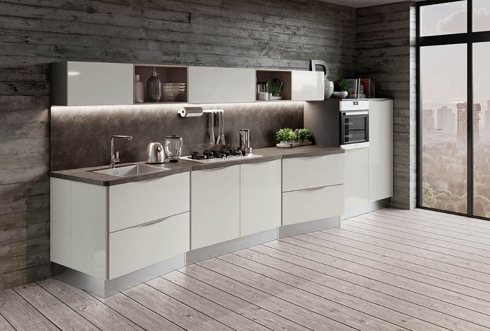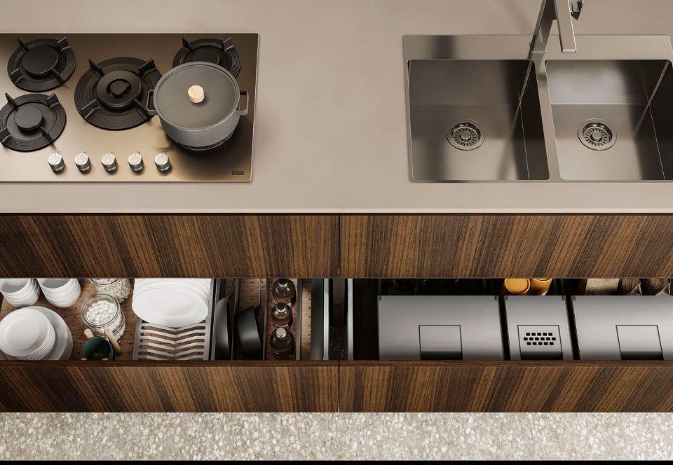 Elegance detaļās un materiālos, piemēram, vertikāls iekšējais apgaismojums un Tecno vitrīnu fasāžu durtiņas. Līnijas un dizains kalpo racionālai darba telpas organizēšanai virtuvē.