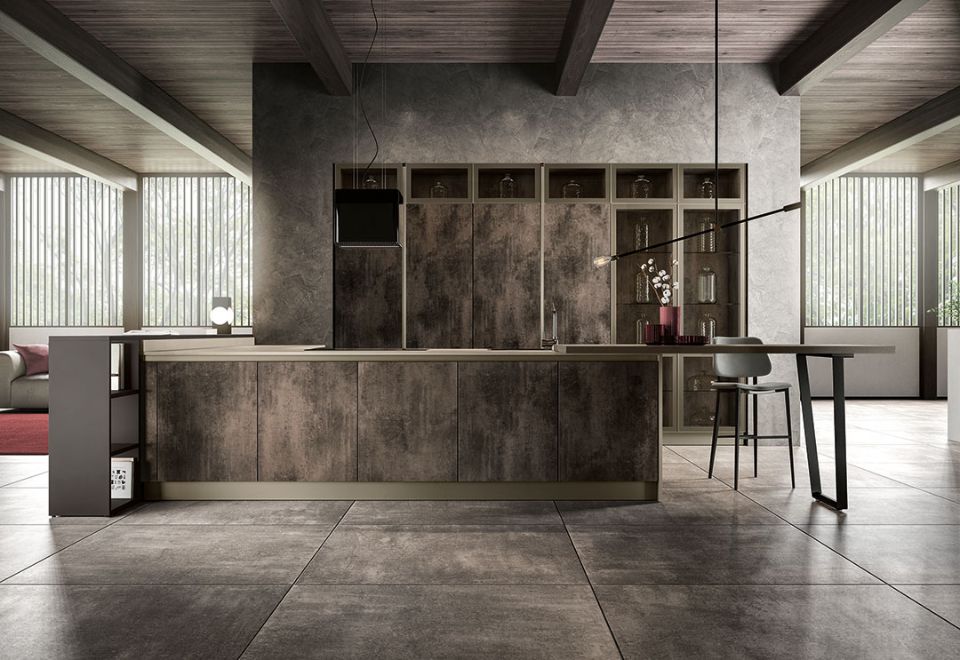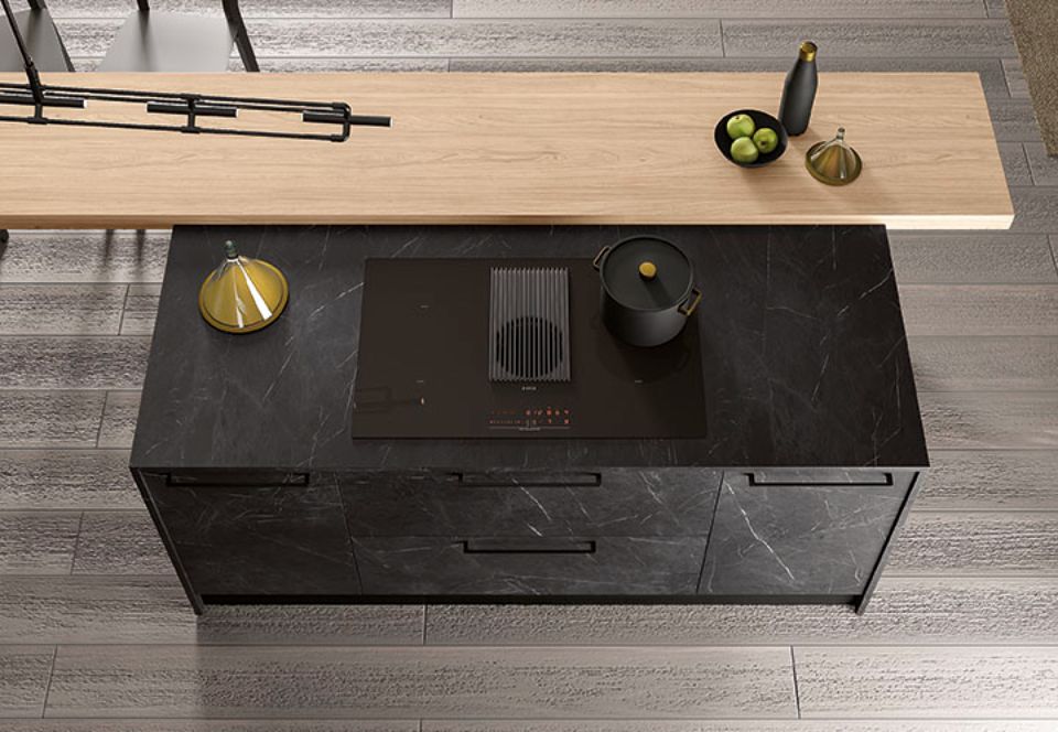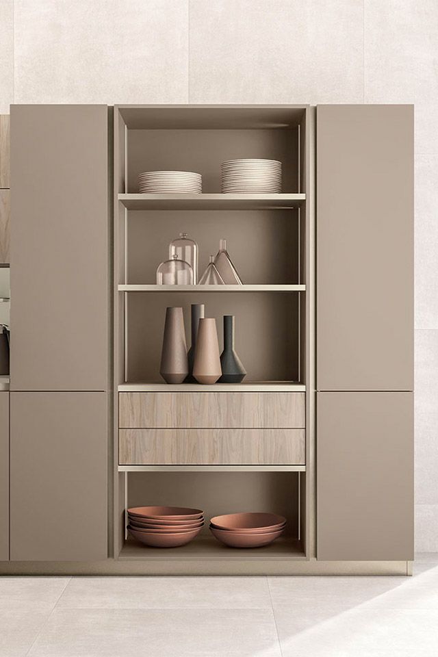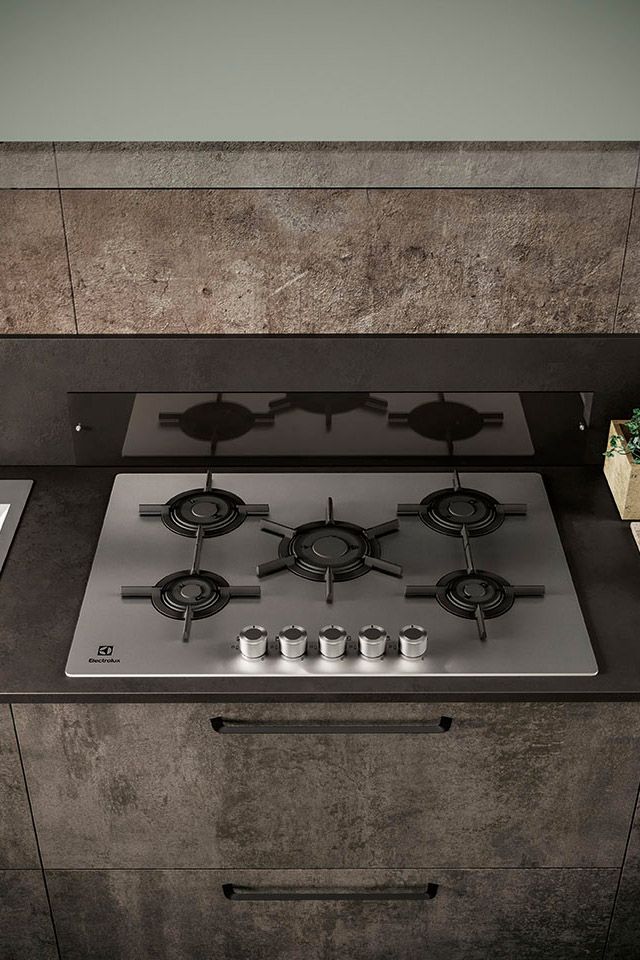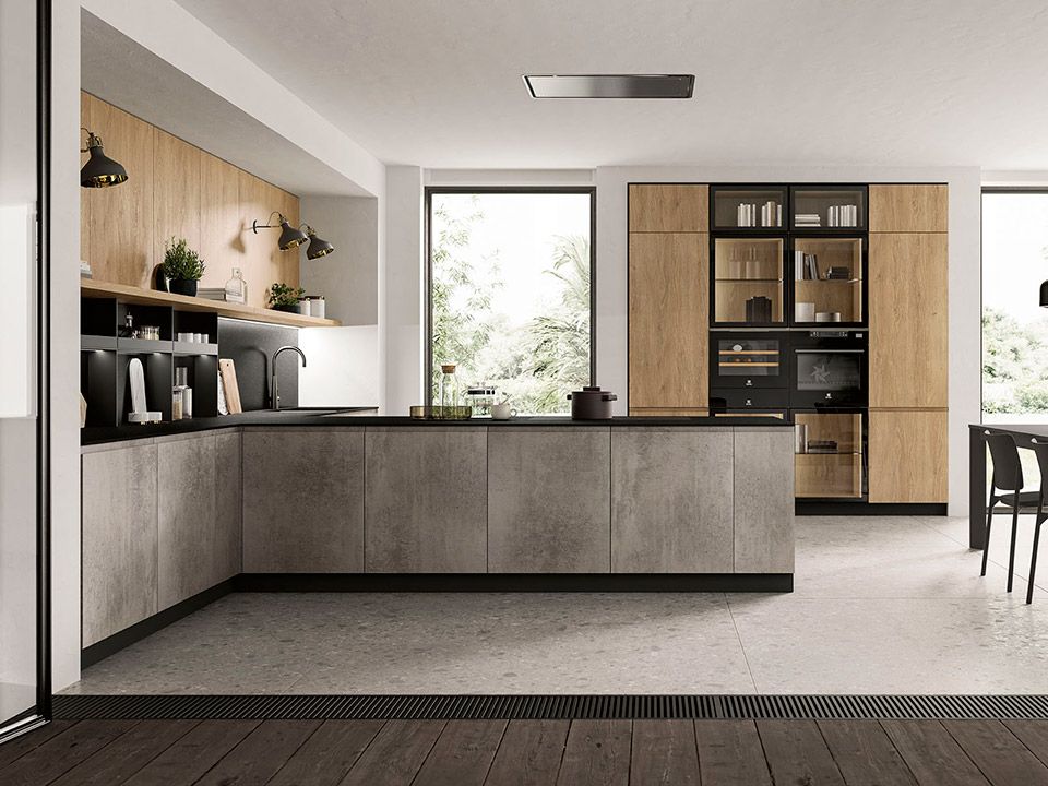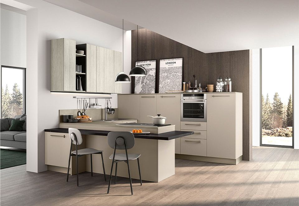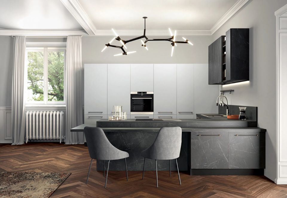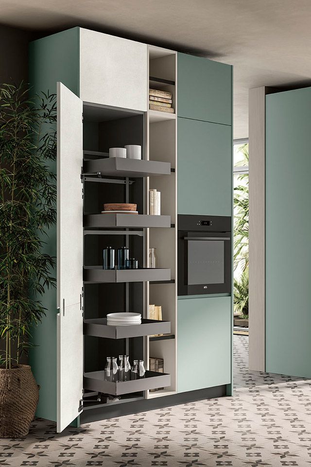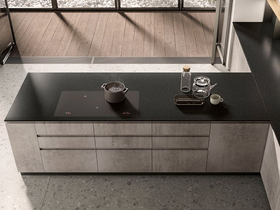 Elegance detaļās un materiālos, piemēram, vertikāls iekšējais apgaismojums un Tecno vitrīnu fasāžu durtiņas. Līnijas un dizains kalpo racionālai darba telpas organizēšanai virtuvē.