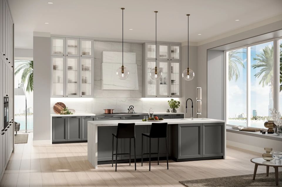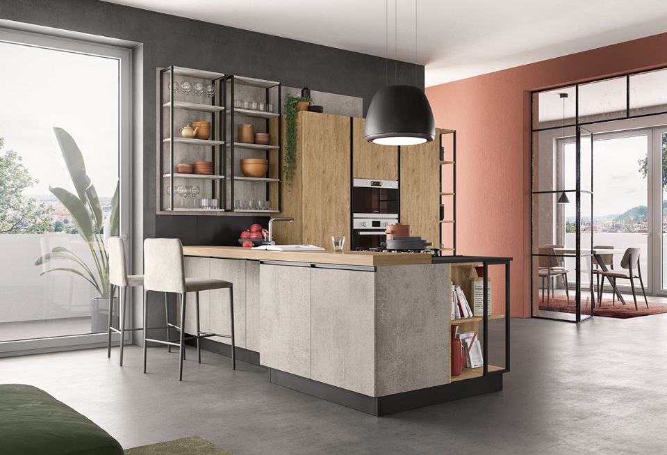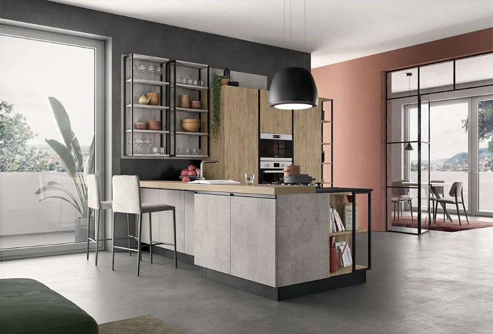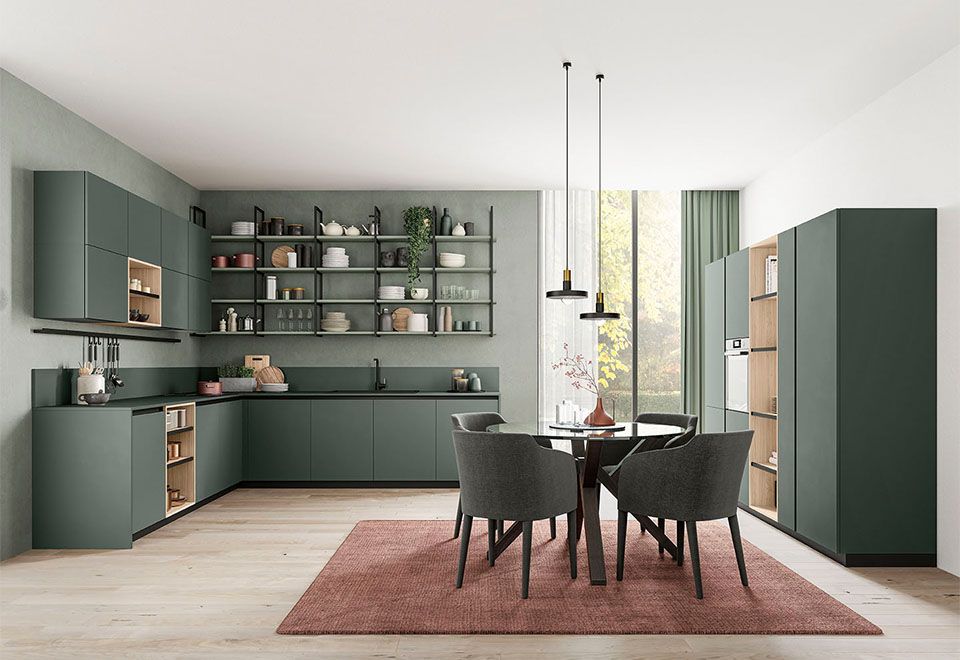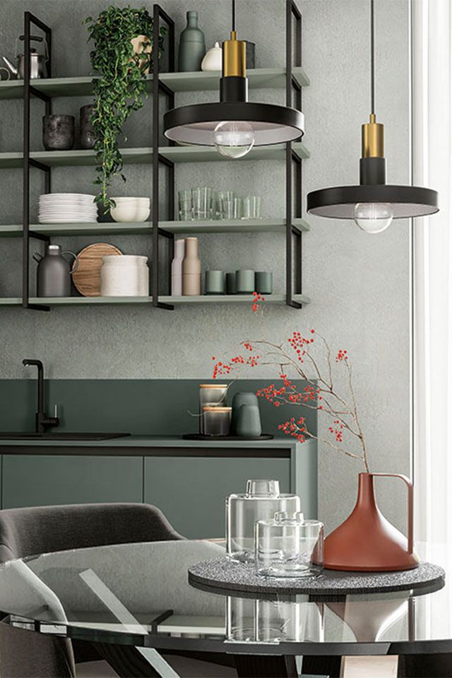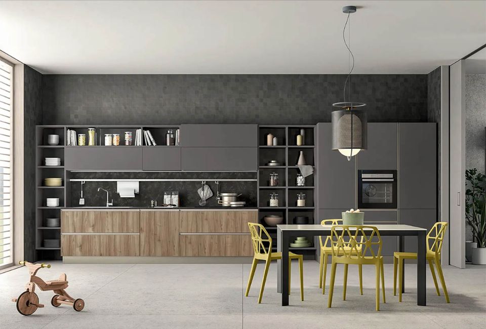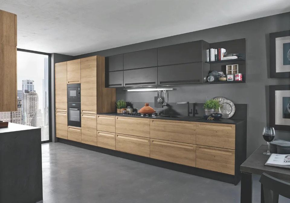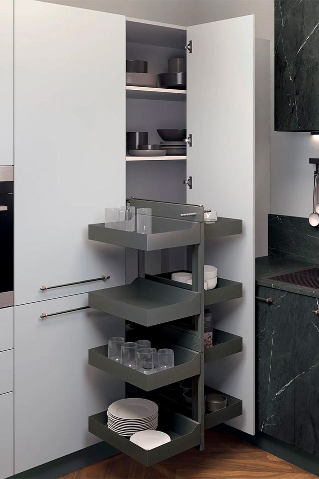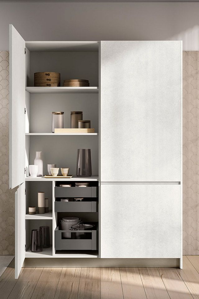 Elegance detaļās un materiālos, piemēram, vertikāls iekšējais apgaismojums un Tecno vitrīnu fasāžu durtiņas. Līnijas un dizains kalpo racionālai darba telpas organizēšanai virtuvē.