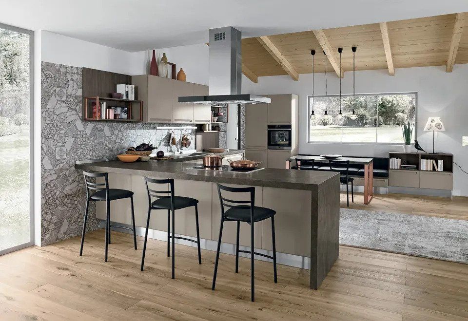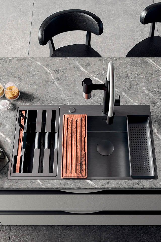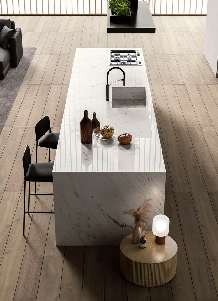 Lungomare ir ne tikai virtuve, bet arī radoša formu un ģeometrijas koncentrācija, kas kalpo ergonomikai. Monolītu elementu ieviešana un dažādu augstumu un dziļumu apvienošanas iespēja ļauj projektēt virtuvi, radot patiesi unikālus risinājumus.