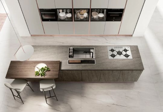 Lungomare ir ne tikai virtuve, bet arī radoša formu un ģeometrijas koncentrācija, kas kalpo ergonomikai. Monolītu elementu ieviešana un dažādu augstumu un dziļumu apvienošanas iespēja ļauj projektēt virtuvi, radot patiesi unikālus risinājumus.